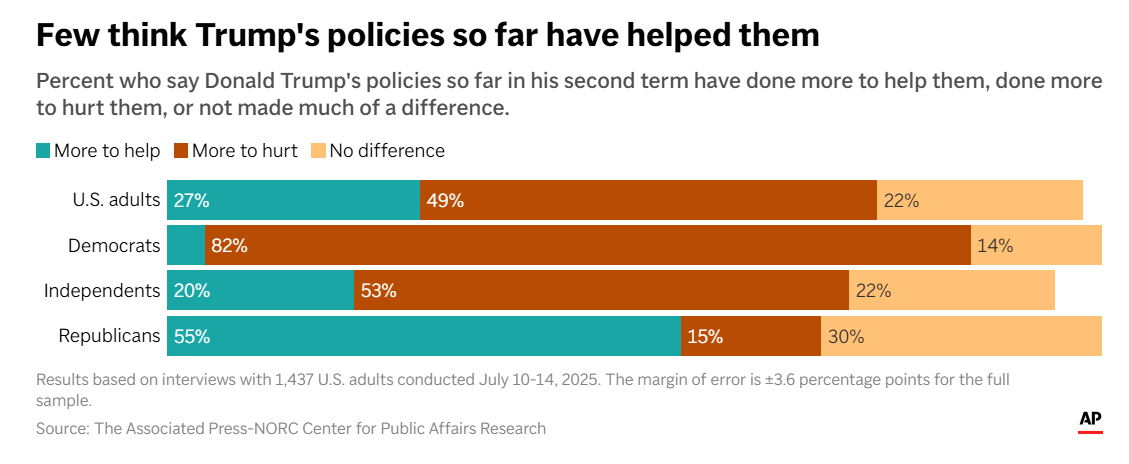 Roughly half of U.S. adults report that Trump’s policies have “done more to hurt” them since his second term began six months ago, the survey found. About 2 in 10 say his policies have “not made a difference” in their lives, with about one-quarter saying his policies have “done more to help” them.