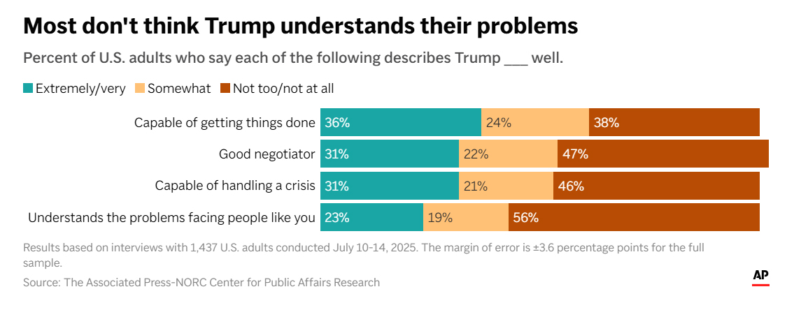 He’s even slipped slightly since earlier this year on immigration, which has consistently been a strength for him in his second term. And while a majority of Americans do see Trump as at least “somewhat” capable of getting things done following the passage of his sprawling budget bill, fewer believe he understands the problems facing people like them.