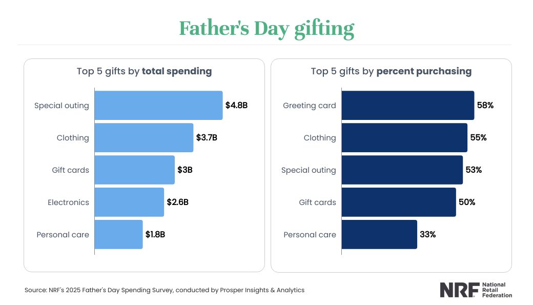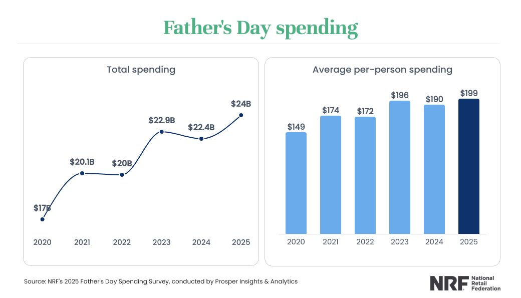 WASHINGTON, D.C. June 5, 2025 — Father’s Day spending is expected to reach a record $24 billion this year, according to the annual survey released by the National Retail Federation and Prosper Insights & Analytics. The figure is up from last year’s $22.4 billion and exceeds the previous record of $22.9 billion in 2023.