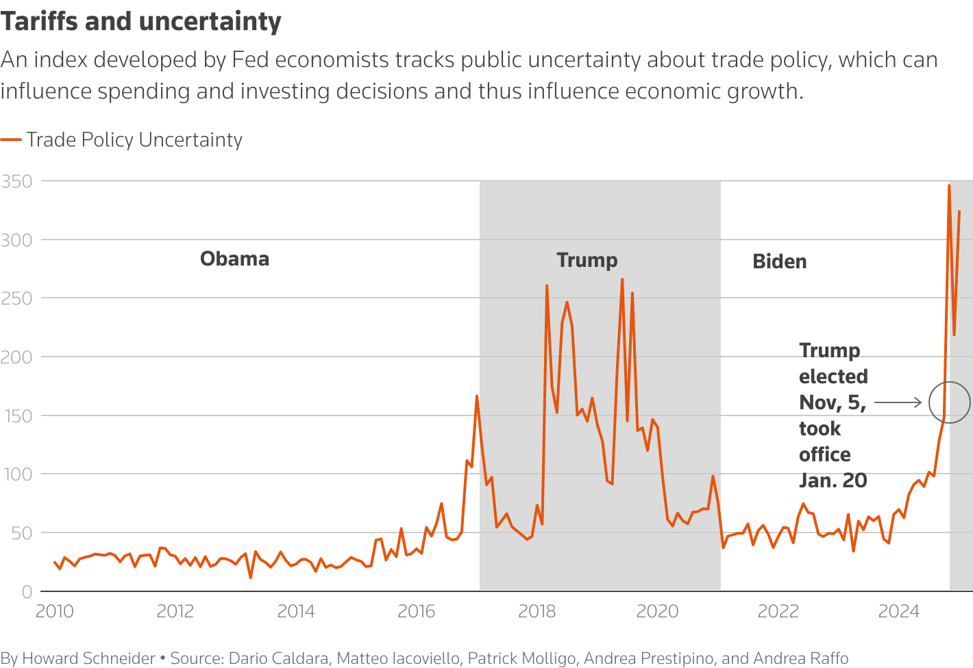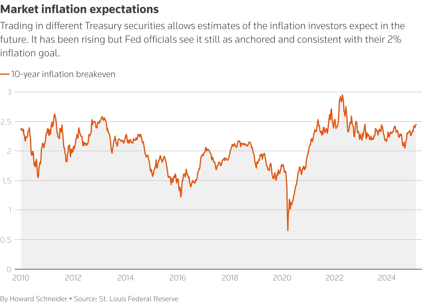 A survey done after Trump’s election by economists Olivier Coibion, Yuriy Gorodnichenko, and Michael Weber found about a third of firms were prepared to raise prices, while about half of all respondents expected prices to rise. About 28% accepted Trump’s arguments that foreign companies will pay for tariffs. So far, Fed officials say they don’t see consumers or markets losing confidence in the central bank’s ability and willingness to return inflation to 2%.