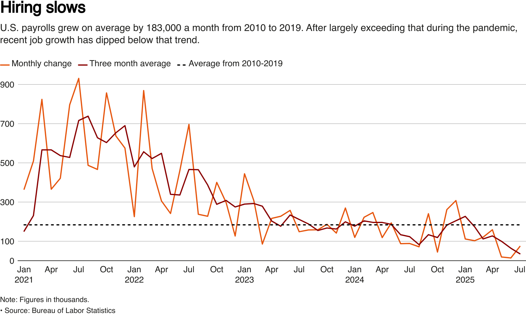 WASHINGTON, D.C. September 3, 2025 — Job growth over the last three months has hit one of the weakest patches, outside the pandemic, since the U.S. economy was limping to recover from the 2007 to 2009 financial crisis and recession. Yet the unemployment rate is the same as it was a year ago at 4.2%, around Federal Reserve estimates of full employment. Wage growth of roughly 4% annually is enough to keep workers ahead of inflation but not so much it raises inflation concerns.