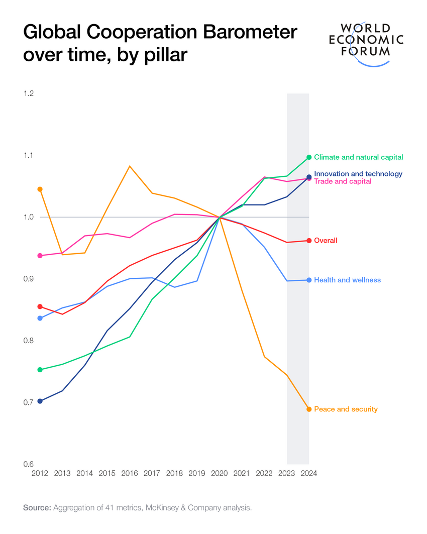 In its third year, the Global Cooperation Barometer 2026, developed in collaboration with McKinsey & Company, uses 41 metrics to assess the level of cooperation worldwide across five pillars: trade and capital; innovation and technology; climate and natural capital; health and wellness; and peace and security.