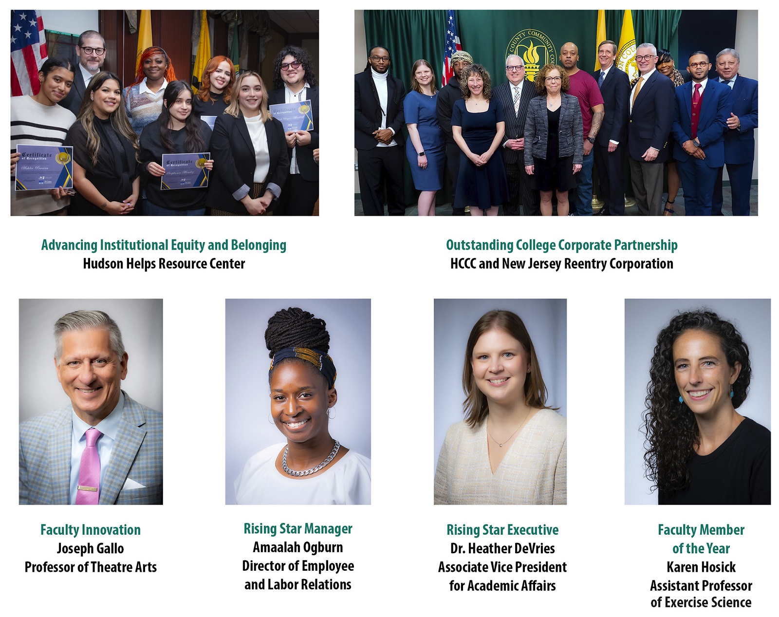 “We congratulate Joseph Gallo, Amaalah Ogburn, Dr. Heather DeVries, Karen Hosick, and our colleagues at the New Jersey Reentry Corporation for their well-deserved recognition,” said HCCC President Dr. Christopher Reber. “We thank them and so many additional HCCC faculty, staff, and students who contributed substantively to achieve these celebrated outcomes.”