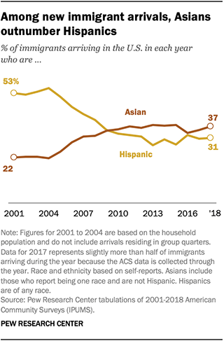 More than 1 million immigrants arrive in the U.S. each year. In 2018, the top country of origin for new immigrants coming into the U.S. was China, with 149,000 people, followed by India (129,000), Mexico (120,000) and the Philippines (46,000). By race and ethnicity, more Asian immigrants than Hispanic immigrants have arrived in the U.S. in most years since 2010.