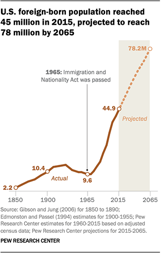 The U.S. foreign-born population reached a record 44.8 million in 2018. Since 1965, when U.S. immigration laws replaced a national quota system, the number of immigrants living in the U.S. has more than quadrupled. Immigrants today account for 13.7% of the U.S. population, nearly triple the share (4.8%) in 1970. However, today’s immigrant share remains below the record 14.8% share in 1890, when 9.2 million immigrants lived in the U.S.