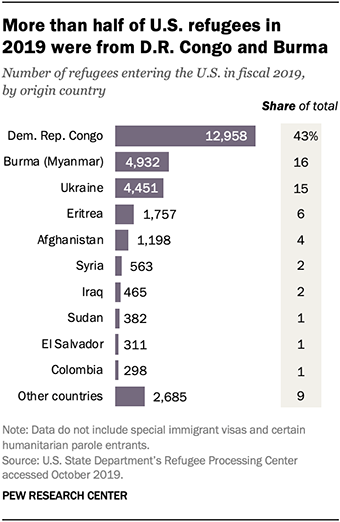 Since the creation of the federal Refugee Resettlement Program in 1980, about 3 million refugees have been resettled in the U.S. – more than any other country. In fiscal 2019, a total of 30,000 refugees were resettled in the U.S. The largest origin group of refugees was the Democratic Republic of the Congo, followed by Burma (Myanmar), Ukraine, Eritrea and Afghanistan. Among all refugees admitted in fiscal year 2019, 4,900 are Muslims (16%) and 23,800 are Christians (79%). Texas, Washington, New York and California resettled more than a quarter of all refugees admitted in fiscal 2018.