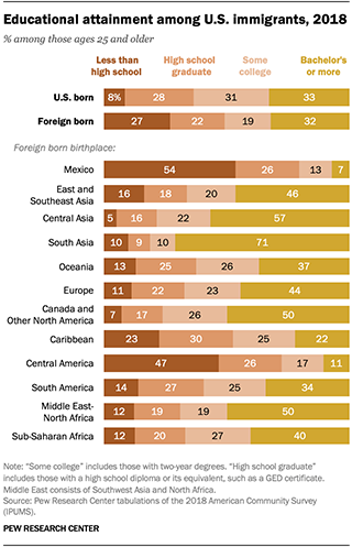 Immigrants in the U.S. as a whole have lower levels of education than the U.S.-born population. In 2018, immigrants were over three times as likely as the U.S. born to have not completed high school (27% vs. 8%). However, immigrants were just as likely as the U.S. born to have a bachelor’s degree or more (32% and 33%, respectively). Educational attainment varies among the nation’s immigrant groups, particularly across immigrants from different regions of the world.