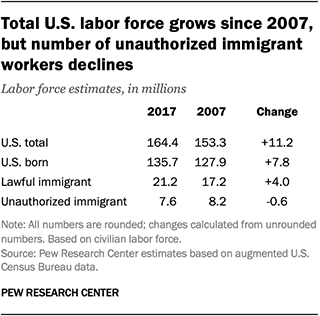 In 2017, about 29 million immigrants were working or looking for work in the U.S., making up some 17% of the total civilian labor force. Lawful immigrants made up the majority of the immigrant workforce, at 21.2 million. An additional 7.6 million immigrant workers are unauthorized immigrants, less than the total of the previous year and notably less than in 2007, when they were 8.2 million.