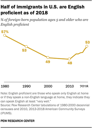 Among immigrants ages 5 and older in 2018, half (53%) are proficient English speakers – either speaking English very well (37%) or only speaking English at home (17%). Immigrants from Mexico have the lowest rates of English proficiency (34%), followed by those from Central America (35%), East and Southeast Asia (50%) and South America (56%). Immigrants from Canada (96%), Oceania (82%), Europe (75%) and sub-Saharan Africa (74%) have the highest rates of English proficiency.