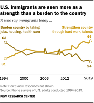 While immigration has been at the forefront of a national political debate, the U.S. public holds a range of views about immigrants living in the country. Overall, a majority of Americans have positive views about immigrants. About two-thirds of Americans (66%) say immigrants strengthen the country “because of their hard work and talents,” while about a quarter (24%) say immigrants burden the country by taking jobs, housing and health care.