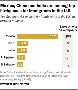 Mexico is the top origin country of the U.S. immigrant population. In 2018, roughly 11.2 million immigrants living in the U.S. were from there, accounting for 25% of all U.S. immigrants. The next largest origin groups were those from China (6%), India (6%), the Philippines (4%) and El Salvador (3%).