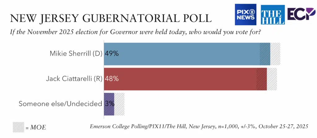 BOSTON, Massachusetts. October 30, 2025 — The final Emerson College Polling/PIX11/The Hill surveys of the New Jersey election for Governor and the New York City election for Mayor find a close race between Democrat Mikie Sherrill and Republican Jack Ciattarelli in New Jersey, and Zohran Mamdani with a significant lead outside the survey’s margin of error in New York City.
