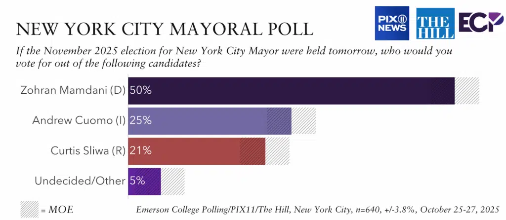 The final Emerson College Polling/PIX11/The Hill survey of the New York City mayoral election finds Zohran Mamdani with a 25-point lead over Andrew Cuomo, 50% to 25%, while 21% support Curtis Sliwa, and 4% are undecided. Since last month, Mamdani’s support increased seven percentage points, from 43% to 50%, Cuomo lost three points, 28% to 25%, and Sliwa gained eleven points, from 10% to 21%.