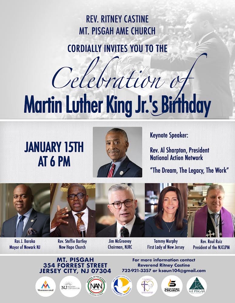 JERSEY CITY, NJ. January 15, 2024 (Biz Republic) — On Monday, January 15 at 6:00 PM at Mt. Pisgah AME Church (Jersey City, NJ), key religious, political, and community leaders will gather to celebrate Dr. Martin Luther King Jr.’s birthday. This celebration event of Dr. Martin Luther King Jr.’s 95th birthday will be accompanied by a speech given by the prominent human rights leader Rev. Al Sharpton.