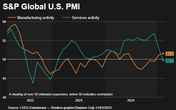 The services sector accounted for the drop in the PMI, contracting for the first time since January 2023. Manufacturing activity rose to an eight-month high, though that was attributed to “front-running potential cost increases or supply shortages linked to tariffs.” The S&P Global survey was conducted between February 10-20. Trump in his first month in office slapped an additional 10% tariff on Chinese imports. A 25% levy on imports from Mexico and Canada was suspended until March.