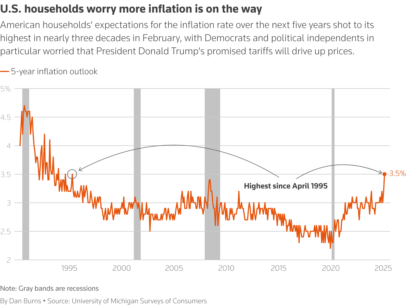 Over the next five years consumers saw inflation running at 3.5%, the highest since 1995, compared with 3.2% in January. The Federal Reserve in January paused its policy easing cycle, having cut interest rates by 100 basis points since September. Minutes of the U.S. central bank’s January 28-29 meeting published on Wednesday showed Trump’s initial policy proposals raised concern at the Fed about higher inflation.