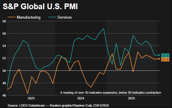 WASHINGTON, D.C. (January 26, 2026) — U.S. business activity was steady in January as an improvement in new orders was offset by a lackluster labor market and lingering concerns among firms over higher costs because of import tariffs, a survey showed. S&P Global said its flash U.S. Composite PMI Output Index, which tracks the manufacturing and services sectors, inched down to 52.8 this month from 52.7 in December. A reading above 50 indicates expansion in the private sector. Both services and manufacturing flash PMIs were little changed this month.