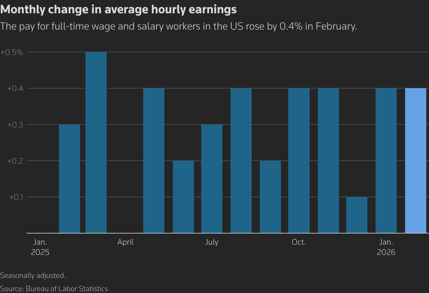 But there was some good news for households. Average hourly earnings rose 0.4% after a similar gain in January. In the 12 months through February, wages increased 3.8% after advancing 3.7% in January.