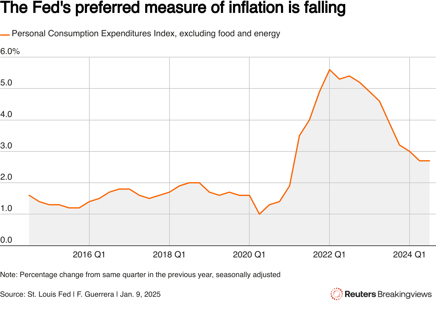 The Fed’s favourite price measure – the core personal consumption expenditures (PCE) index, which excludes volatile energy and food – is growing at an annual rate of 2.8%. Goldman Sachs analysts expect this key inflation metric to hit the Fed’s 2% target in 2025, absent any giant new Trump trade duties.