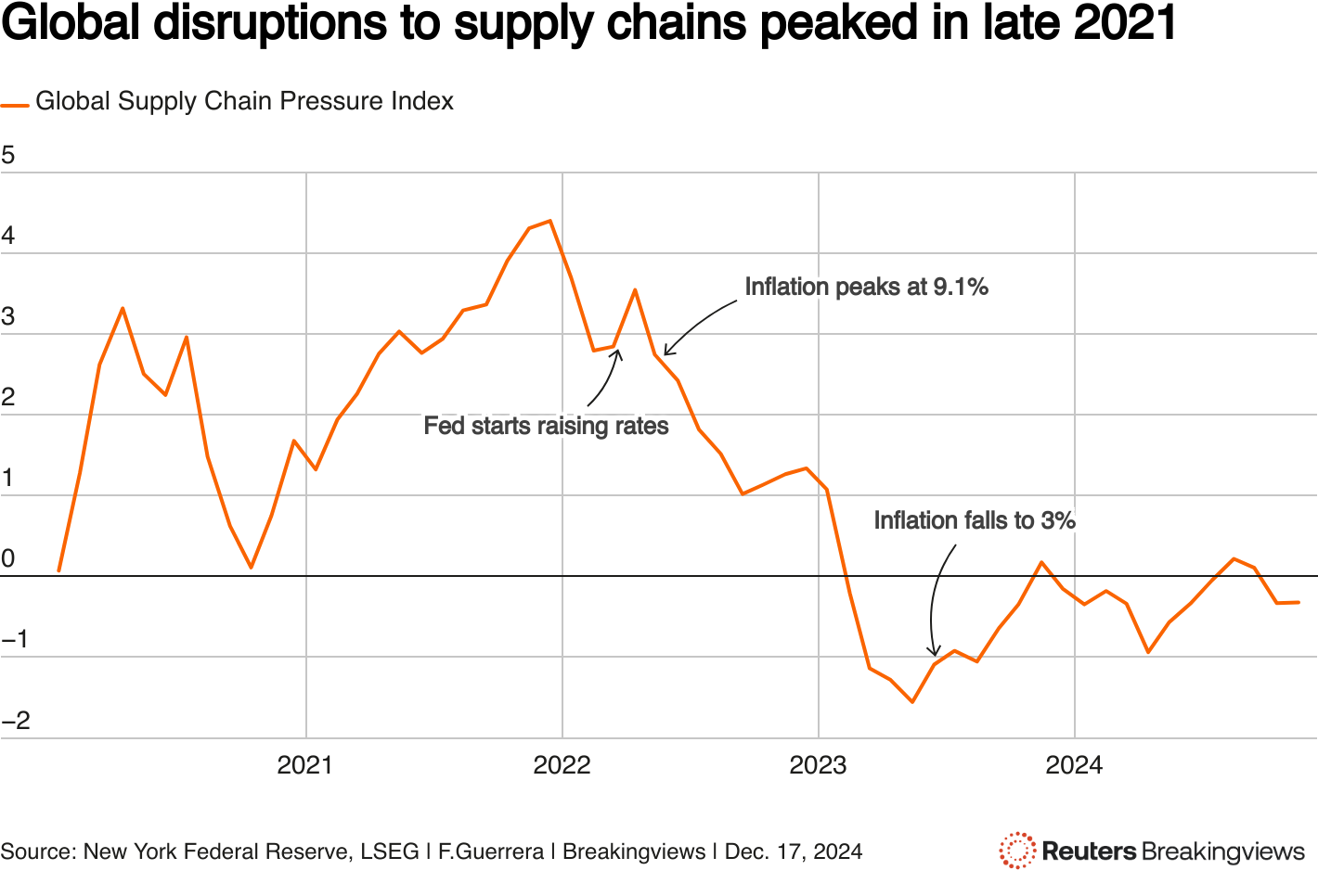 An index of supply-chain pressure compiled by the New York Fed illustrates this point. By the time Powell started raising rates in March 2022, that index was below its record high, but still very elevated. Consumer prices, meanwhile, were rising at a heady annual rate of 8.5%. They peaked at 9.1% in June 2022, but they were back down to 3% a year later. In those months, the Fed did raise rates from around 0% to around 5.3%. But also in that period, supply chain problems plummeted before disappearing entirely in February 2023, according to the New York Fed’s measure.